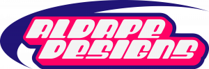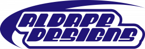 The Aldape Designs logo features three colors, a muted white typeface inside a pink-ish highlight surrounded by a dark blue border.