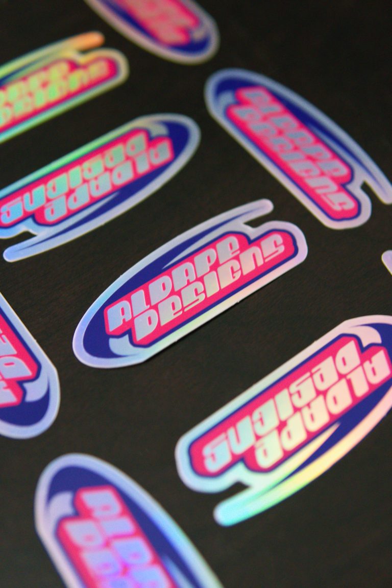The Aldape Designs sticker features a clean Y2K look with its holographic texture.