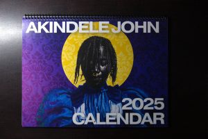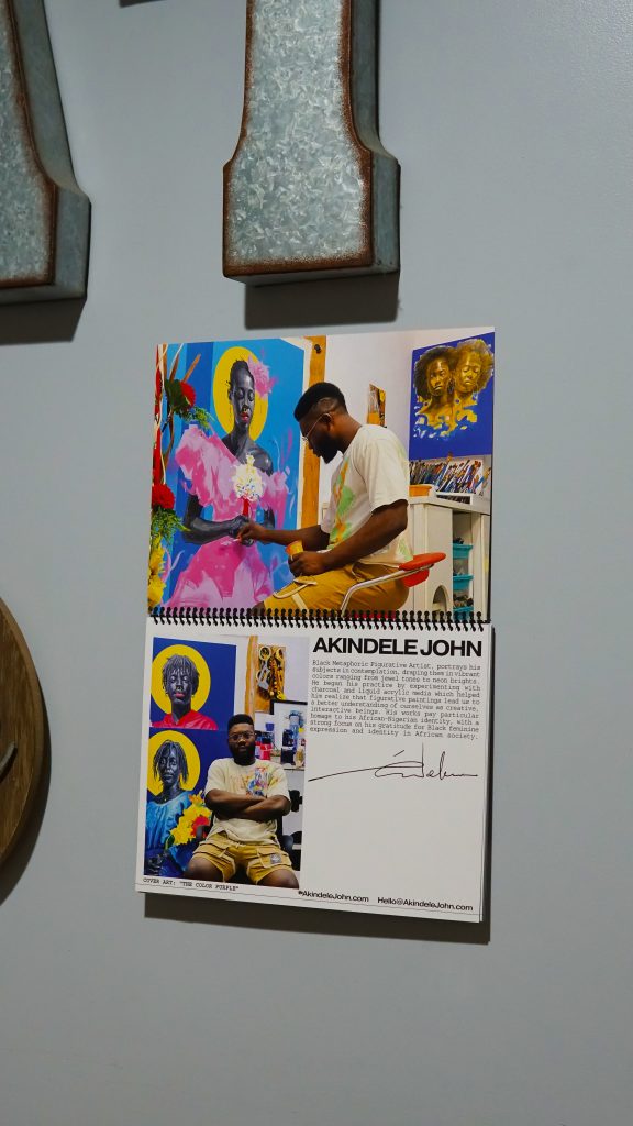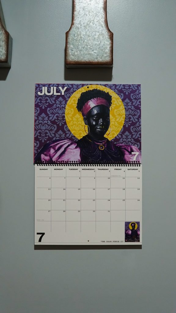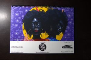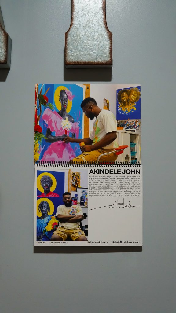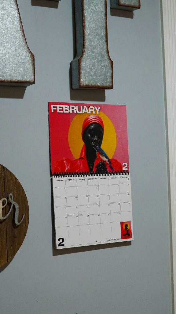 Each month features different artwork by Akindele John. The very first page is the artists “about” page. Akindele John is a Black Metaphoric Figurative who portrays his subjects in contemplation, draping them in vibrant colors ranging from jewel tones to neon brights. He began his practice by experimenting with charcoal and liquid acrylic, media which helped him realize that figurative paintings lead us to a better understanding of ourselves as creative, interactive beings. His works pays particular homage to his African-Nigerian identity, with a strong focus on his gratitude for Black feminine expression and identity in African society.